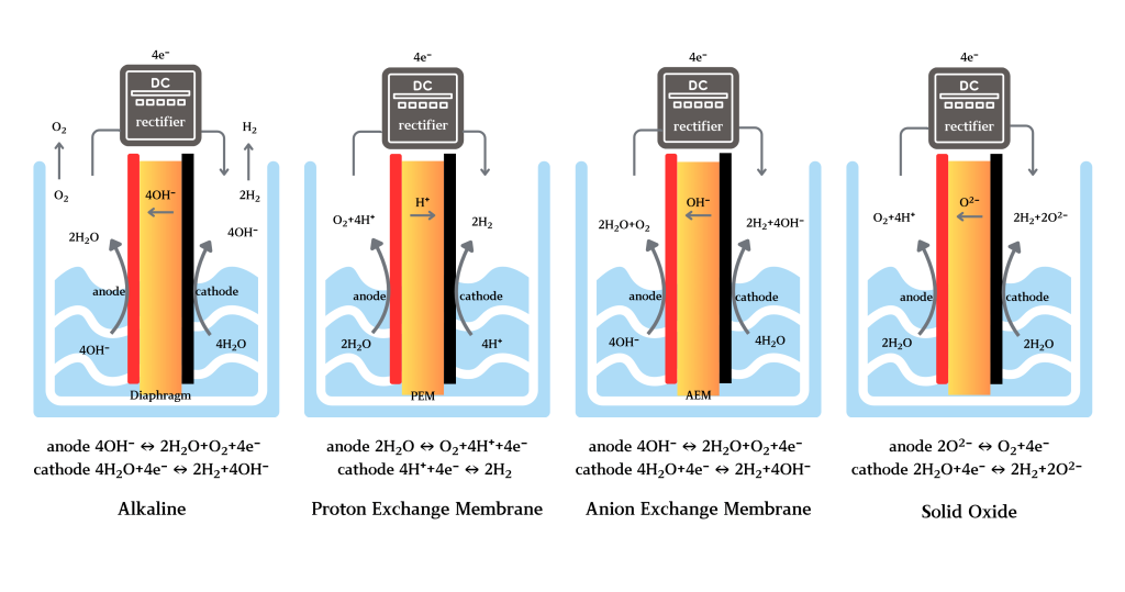 Electrolysis splits water into hydrogen and oxygen using an electrochemical process. Variants include alkaline electrolysis (ALK), proton exchange membrane electrolysis (PEM), anion exchange membrane electrolysis (AEM), and solid oxide electrolysis (SOEC). Electrolysis is critical for decarbonizing energy systems, enabling clean hydrogen production for applications in energy storage, transportation, and chemical manufacturing.