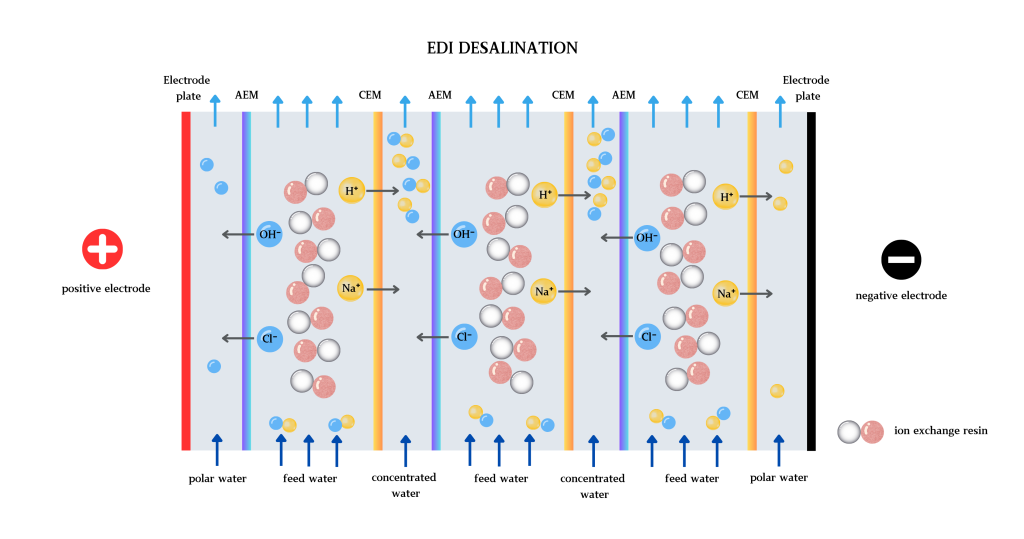 EDI combines ion exchange resins, membranes, and electric fields to produce ultra-pure water without chemical regeneration. It achieves continuous desalination under the influence of a direct current electric field.