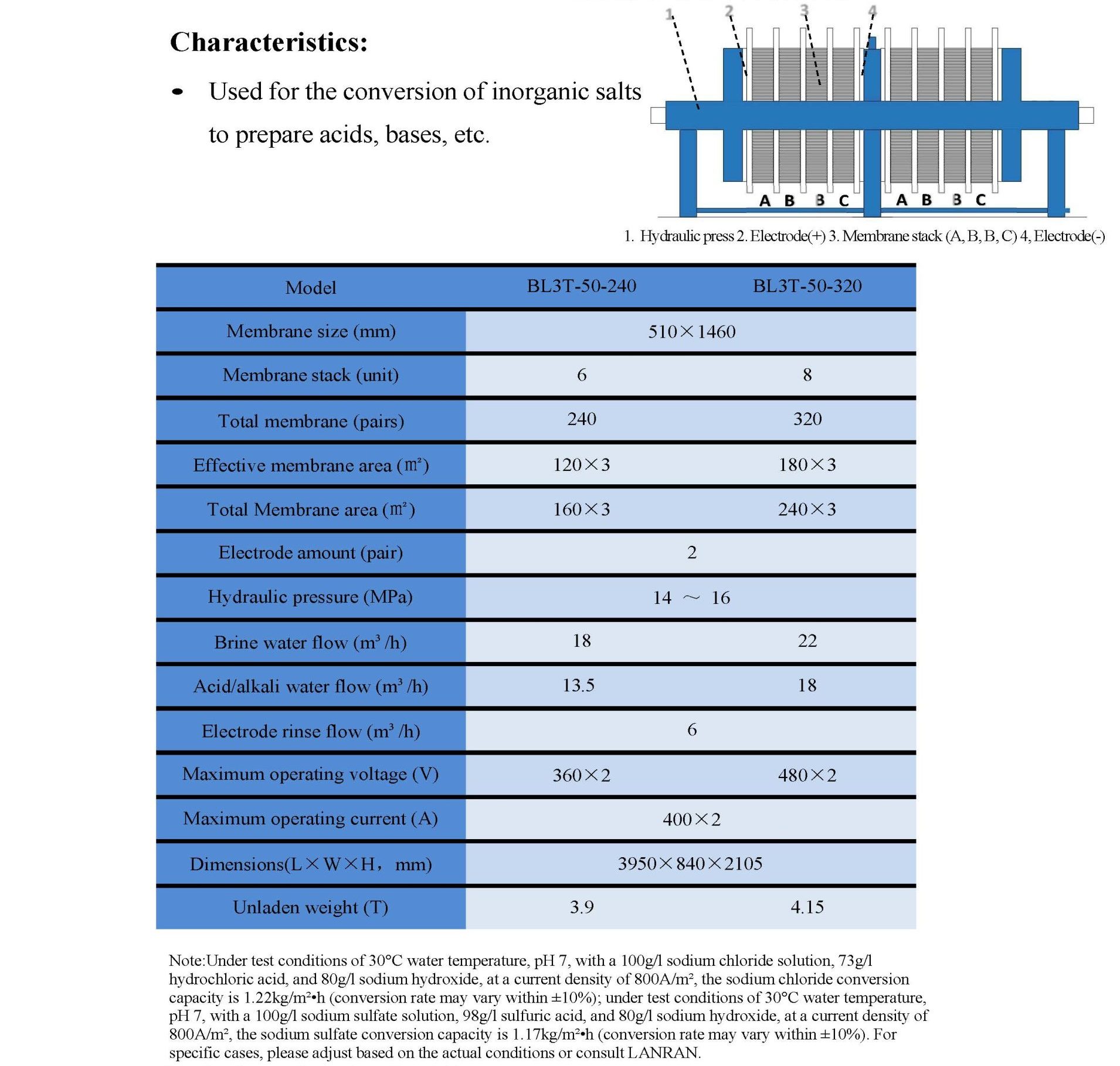 BL3T-50-240/320 Three-chamber bipolar membrane stack Used for the conversion of inorganic saltsto prepare acids, bases, etc. Specifications:
